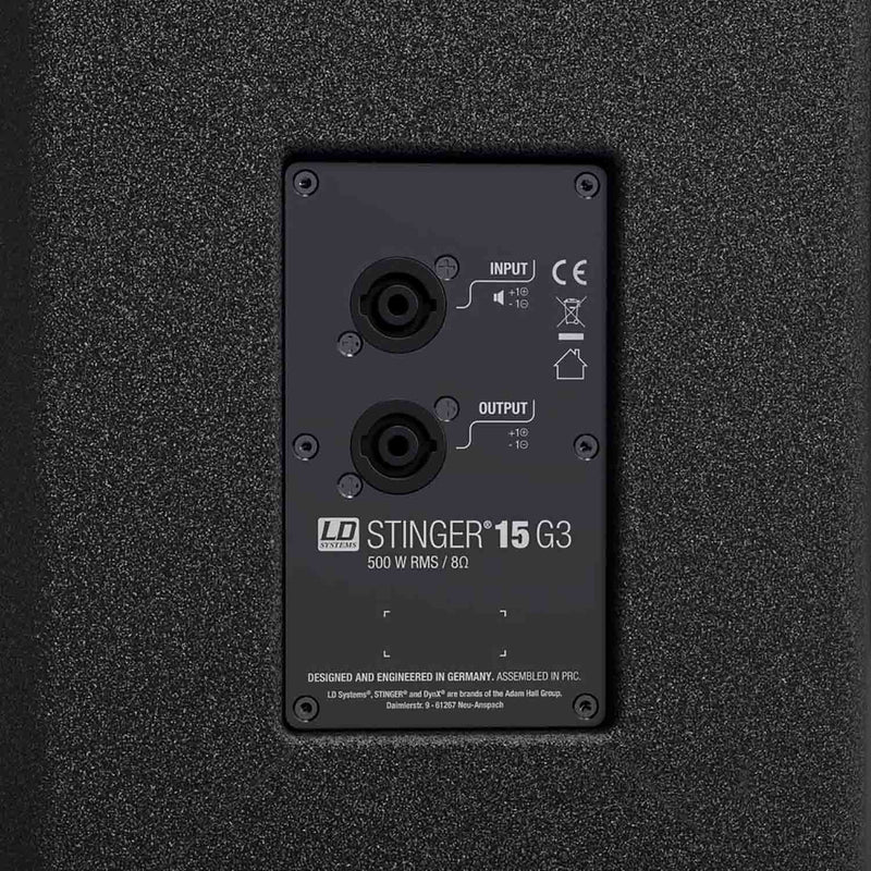 This highly professional 2-way loudspeaker is designed for absolute, long-term reliability. With its multifunctional bass reflex cabinet as a full-range speaker, satellite, and ground monitor, it is suited to mobile and fixed PA systems. The Stinger 15 G3 provides 500 watts of continuous power; the maximum sound pressure level is 127 dB. Its specially developed 15" woofer and the BMS HF driver achieve a powerful bass reproduction and fresh natural highs. The waveguide of the tweeter has been developed using the Boundary Element Method (BEM), a numerical simulation of the sound radiation and dispersion. It reduces reflections from the floor and ceiling and prevents sidelobe levels and thus achieves a controlled and homogeneous dispersion.