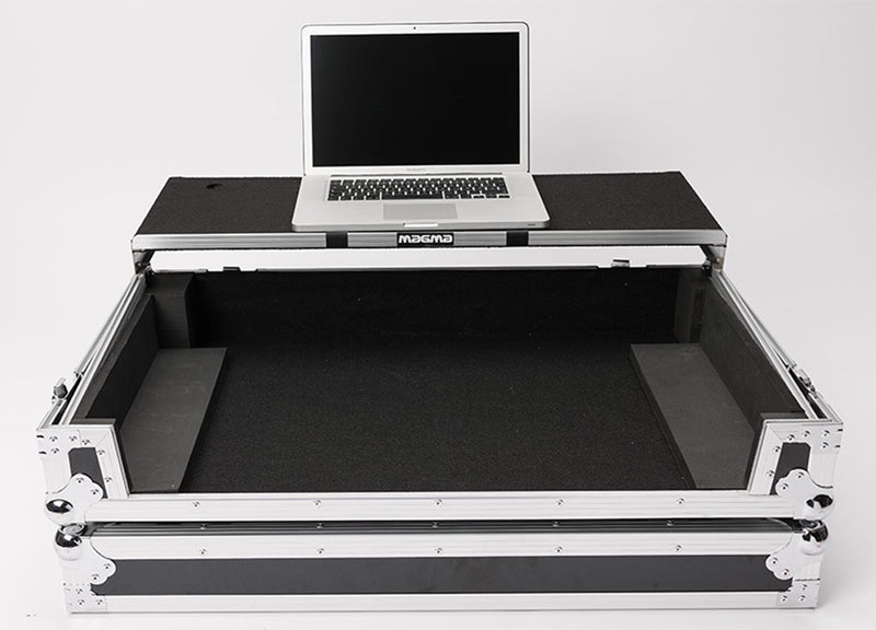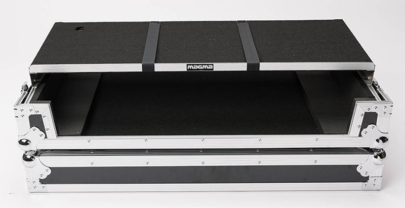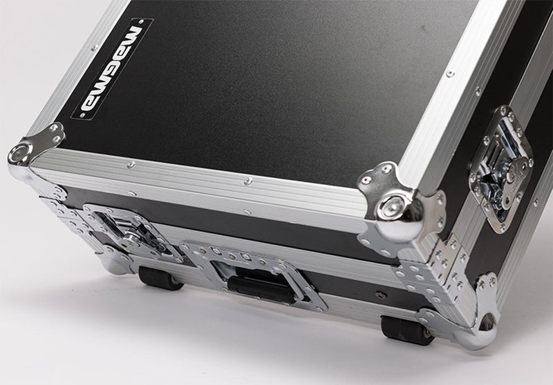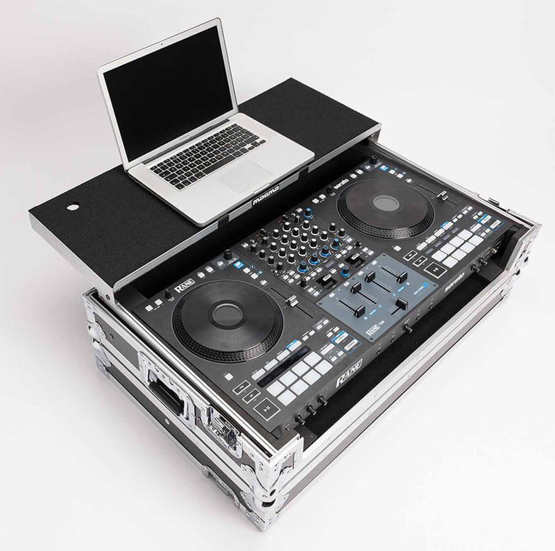 The MAGMA MGA41026 DJ-Controller Workstation Rane Four and Performer W/ Wheels customized to hold the new Rane Four DJ-Controller. Crafted from 9 mm vinyl laminated plywood, sturdy aluminium profiles, heavy duty butterfly latches and smooth rolling wheels, this case provides ultimate protection for mobile use on the road.