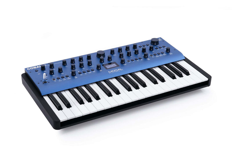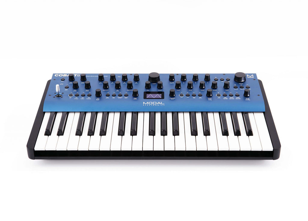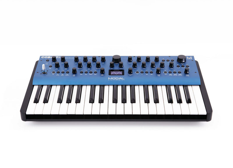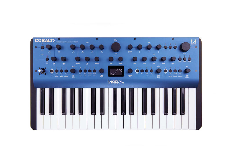 The Modal COBALT8 37-Key Synthesizer delivers rich virtual-analog sound with 8-voice polyphony and advanced sound-shaping power. Two independent oscillator groups with up to 4 oscillators each generate not only powerful virtual-analogue goodness, but like no other synthesiser before, 40 unique complex algorithms like Sync, Ring Modulation, Waveform Morphing, and many more are available to increase the creative options for new-generation synth sounds. Each Algorithm has a simple-to-use pair of controls selected to suit the particular algorithm or character, providing musicians the power of traditionally complex oscillator modulations or processes spontaneously.