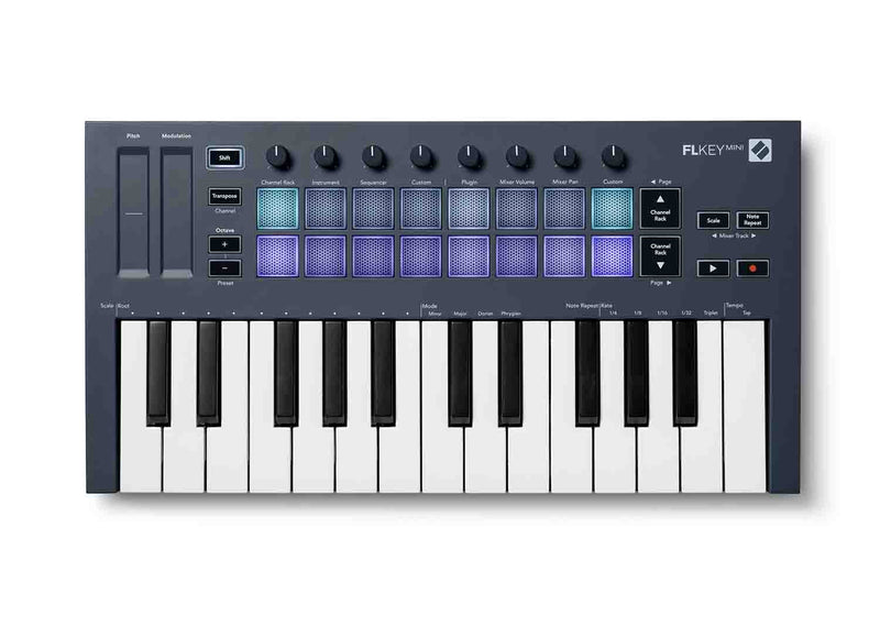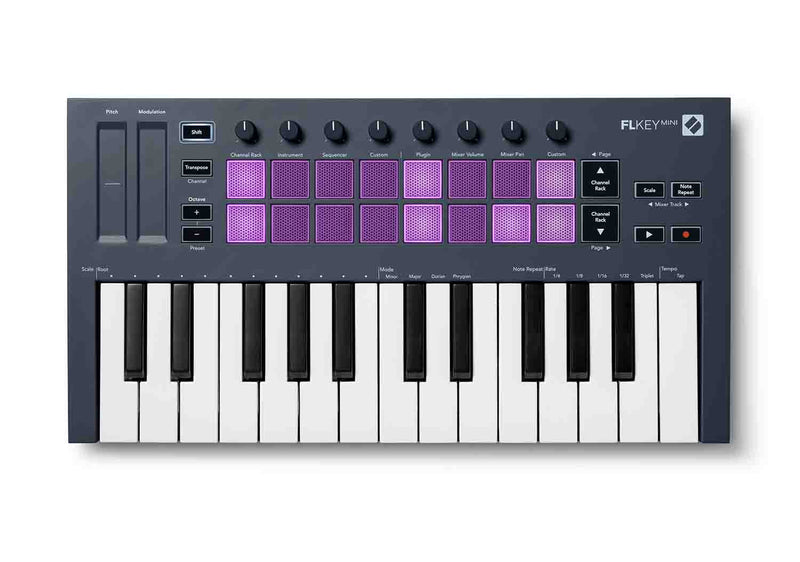 The Novation FLkey Mini is a Compact MIDI Keyboard Controller for FL Studio. FLkey Mini is the ultimate compact 25-mini-key MIDI keyboard for making music in FLStudio. Combining hands-on control of the most important FL Studio features with our best mini keys to date, FLkey Mini puts production in your hands and connects you with your music. Sequencer Mode maps FLkey Mini’s pads to FL Studio’s step sequencer for sketching beats fast. Two Pad modes give your rhythms a real human feel and get you off the grid play straight into the Channel Rack or FPC, and trigger slices in SliceX. Need some crisp hi-hat rolls.