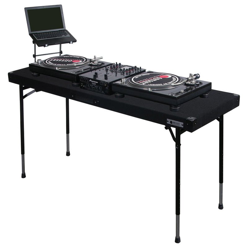 Odyssey CTBC2060 DJ Table measures 60 inches wide and 20 inches deep and comes with a pre-tapped port hole for cable runs and a strap handle for easy carrying. a sturdy and clean looking work surface to set up your system or music. The folding leg system is height-adjustable from 26 to 38 inches.