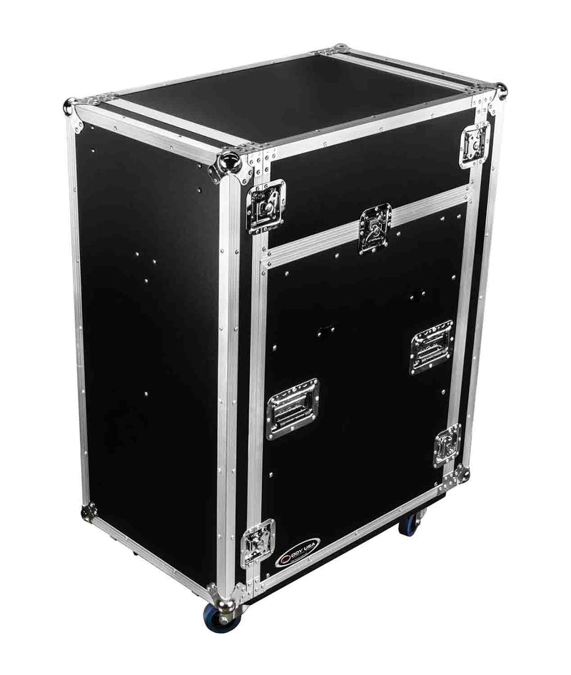The Odyssey FZ1416WDLX-II Deluxe 14U Top Slanted 16U Bottom Vertical Pro Combo Rack with Two Side Tables and Casters is a professional-grade case with two integrated side tables and heavy-duty casters, making it great for pro-audio event production, mobile DJs, lighting technicians, and more. The case is made of ABS plastic laminate over 3/8" plywood and designed to protect and transport audio mixer, controller, amplifiers, and rack gear. The angled top helps provide easy access to controls, while the 16 rack spaces below house and protect your precious amplifiers and signal processors.