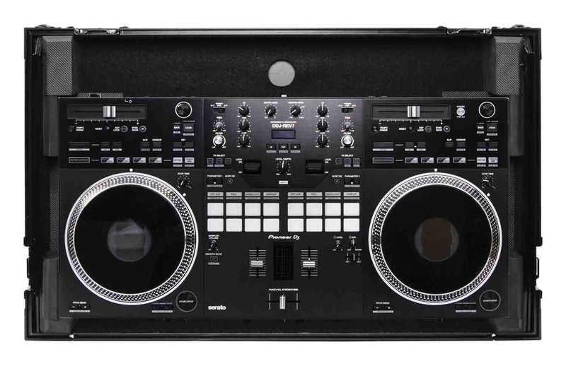 The Odyssey FZGSDDJREV7WBL is a Glide Style Flight Case for Pioneer DDJ-REV7 Controller with Wheels and Laptop Platform - Black - Black. All Case Constructs with Black Anodized and Powder Coated Hardware furthermore gears are not included, this is only the case.
