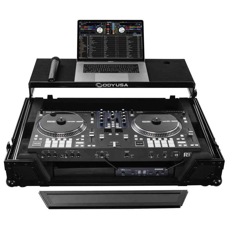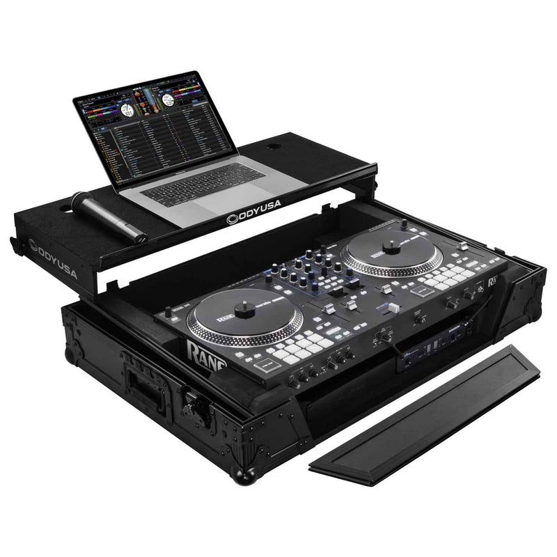 This case improves upon the Odyssey case by adding a 19" 1U rack space underneath the controller compartment. The addition of the 1U rack space further organizes your gig gear such as the wireless mic system, the power strip, the drive rack, or the storage drawer into the case. If the rack space is not needed, the rack mounting hardware can be removed to make storage for your other essential gear.