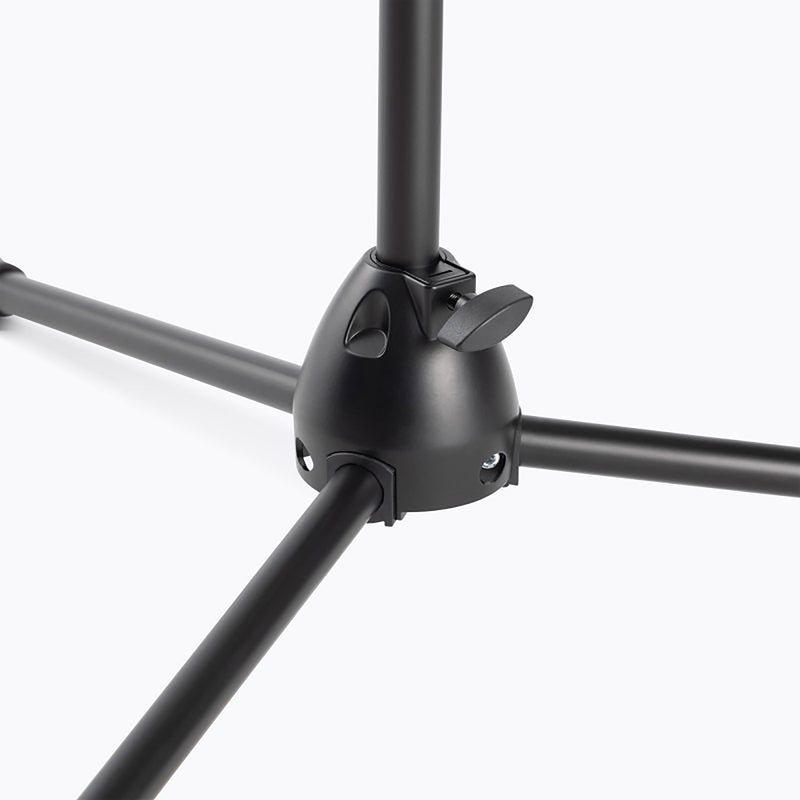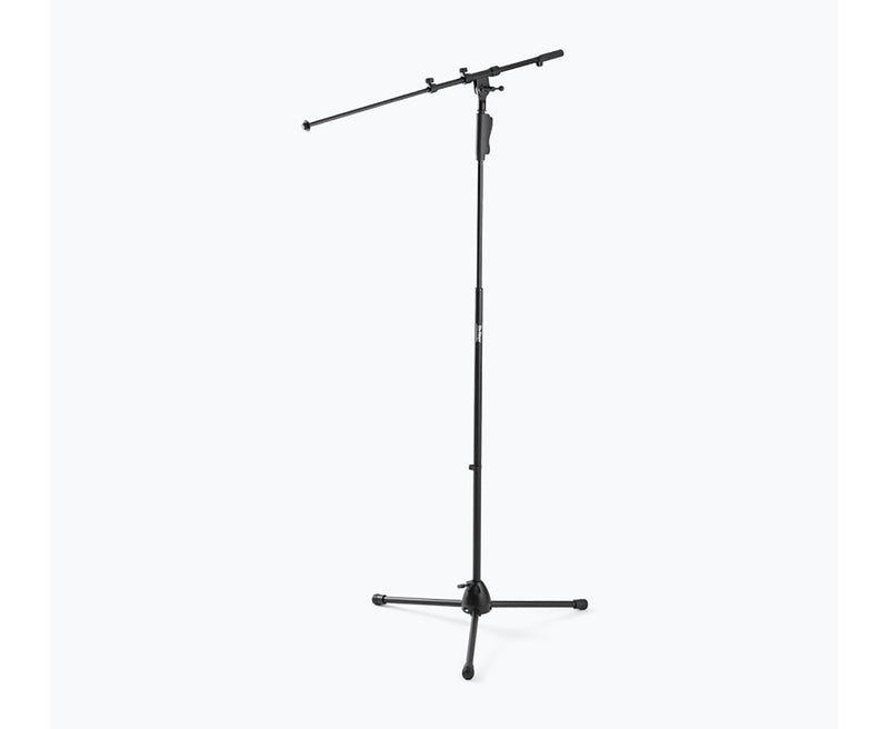 The On Stage MS7550, One-Handed Mic Stand with Tripod Base features a specialized clutch that enables adjustment of the overall stand height using only one hand. The clutch, which releases when squeezed and locks automatically when released, is attached to the upper shaft for quick, easy height adjustments. Not only does the telescoping mic boom adjust in angle and rotation but it also adjusts in length, making it easy to position a mic for best sound while keeping the base out of the way of performers and instruments. The tripod base delivers outstanding balance and stability while rubber feet on the legs prevent sliding to keep the stand firmly in place. With its black powder-coat finish that resists chips and scratches, this versatile accessory will remain looking fresh while adding to a professional presentation in any venue, recording studio, or streaming setup.
