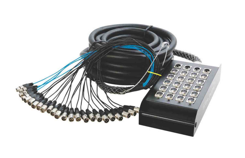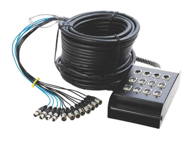 The On Stage SNK4100V2, 8 x 4 Snake Box designed for use in live applications. It sports a fan-out at one end, a stage box at the other, and 100' of cable in between. The stage box provides eight XLR inputs and four XLR returns, and the fan-out offers the connections in reverse: eight XLR outputs and four XLR inputs. In total, there are 12 channels.