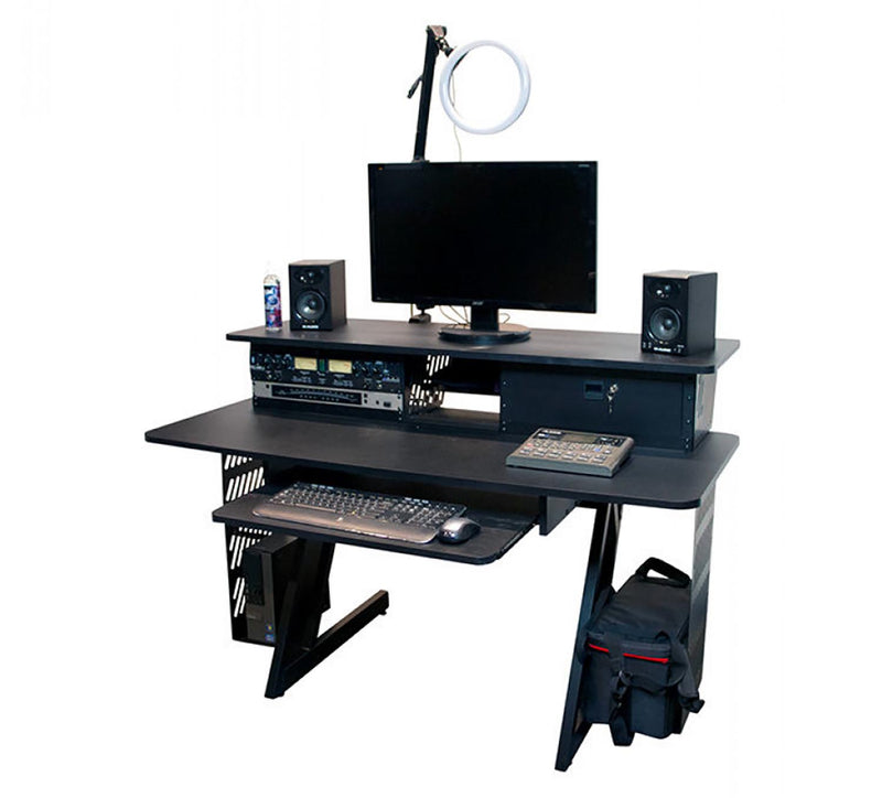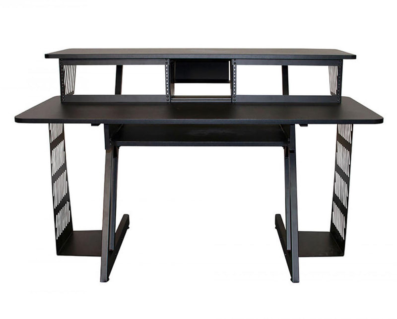The On Stage WS7700B is a sturdy desk has a place for computers, studio monitors, MIDI controllers, rackmount components, and recording and mixing equipment, making it easy to keep gear organized and ready to use. A slide-out keyboard tray and an elevated platform for a monitor and speakers increase work space and enhance operating comfort. In addition to a spacious desktop that supports a wide range of mixers and keyboard instruments, two 3U shallow racks provide a space for rackmount components totaling 6U. To top off this efficient and orderly setup, a mobile device slot-stand and two computer holders keep delicate electronics safe and conveniently within reach.