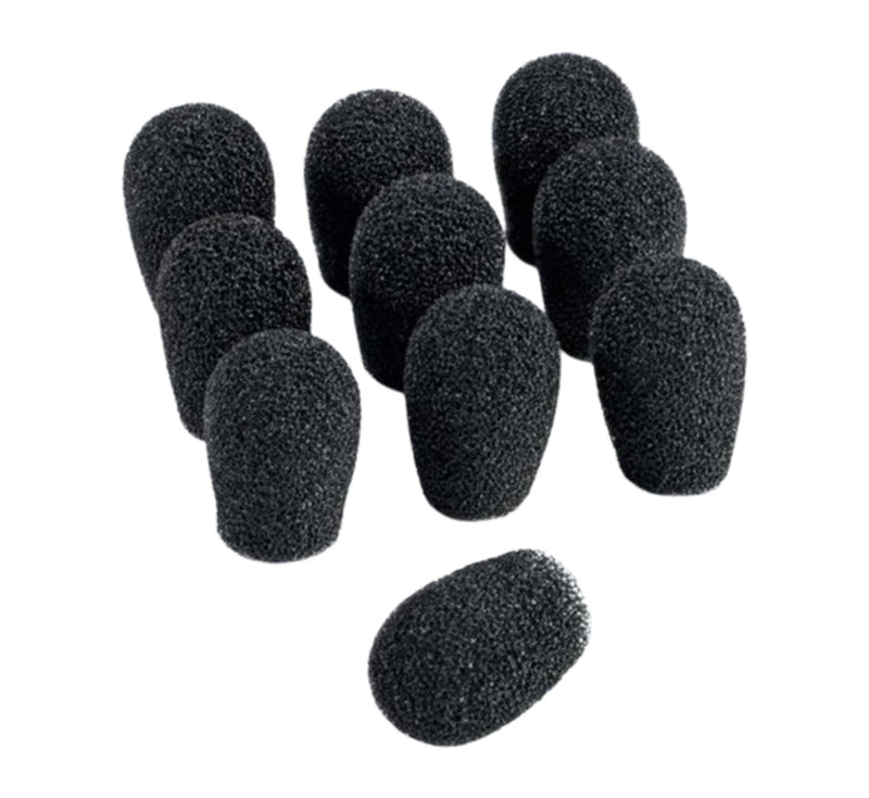The Onstage ASWS20B10 Windscreens for Headset Microphones - 10 Pack reduce wind, breath, and plosive noises to improve sound quality. The flexible foam provides a snug hold that prevents slipping and completely covers the mic, shielding it from dust, debris, and moisture. This pack includes 10 black windscreens that stretch to fit popular headset mic brands including DPA, Countryman, and Point Source.