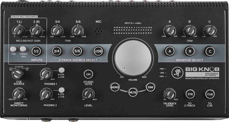Two Onyx mic preamps deliver a convenient, high-quality desktop recording source coupled with high-resolution 192kHz/ 24-bit audio conversion for solid sound quality Whether recording or mixing. With dual headphone outs, dedicated amp-driven studio output, and flexible I/O options, big knob studio+ is truly a nerve center for any professional studio.