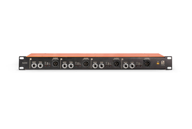 The Palmer Bridge 4A, is a 4-channel, active DI box in 19" rack format for feeding the unbalanced and high-impedance signals of electric instruments such as guitar, bass, keyboard or synthesizer into the microphone inputs of a mixing console. It provides a transformer-balanced, low-impedance signal at the outputs and eliminates mains hum and interference caused by ground loops. This keeps the sound unadulterated: brilliant, low-noise and without interference.