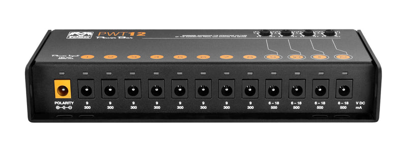 The PWT 12 is a heavy duty (2000 mA) universal pedal board power supply with 12 single-isolated 9 V DC, center-negative female pin-connector outputs. The variable outputs enable the simulation of voltage drop or 'battery sag' in old batteries. The power supply is regulated for constant voltage supply and protected against short circuit and overloading. The PWT 12 is equipped with a power LED and a two-color LED output status indicator. It is supplied with an AC adapter and a set of DC cables. The PWT 12 is the ideal solution for power-hungry foot pedals or 9-volt effects units that can be operated at higher voltages for increased dynamics and stability.