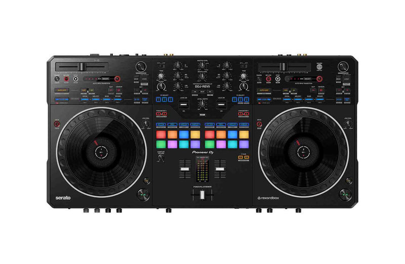 The Rev5 is a Scratch-Style 2-Channel Performance DJ Controller. The DDJ-REV5 is a new-generation controller with Serato DJ Pro and rekordbox compatibility. This 2-channel unit offers an authentic scratch experience and innovative features including its large jogs, MAGVEL FADER, dedicated buttons for Stem’s control, the first-ever Auto BPM Transition, and Piano Play mode.