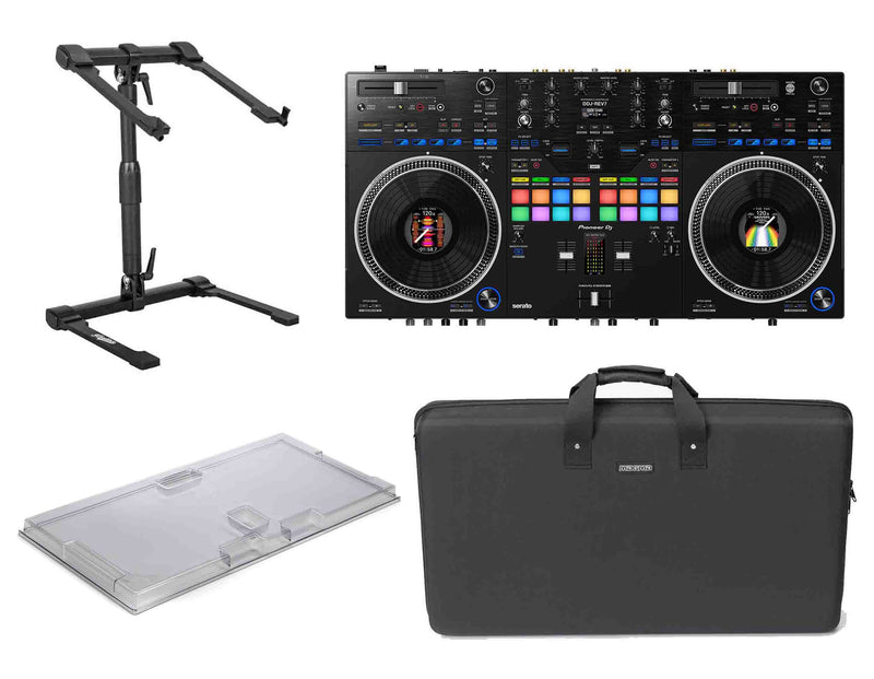 The Pioneer DDJ-REV7, 2-Channel DJ Controller Package comes with 1 Pioneer DDJ-REV7 Scratch Style 2-Channel Professional DJ Controller for Serato DJ Pro Black, 1 Decksaver DS-PC-DDJREV7 Pioneer DJ DDJ-REV7 DJ Controller Cover, 1 Magma MGA48039 Lightweight CTRL Case DDJ-REV7 and 1 Headliner HL20013 Gigastand Laptop Stand.