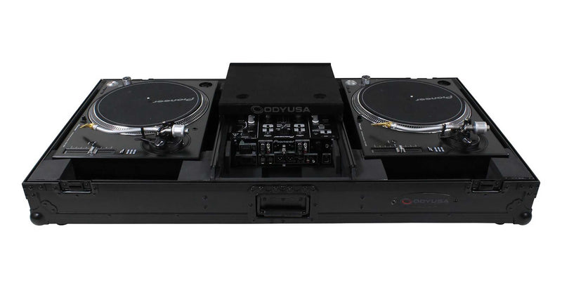• 1 Odyssey FZGSLBM10WRBL Black Low Profile 10″ Format DJ Mixer and Two Battle Position Turntables Flight Coffin Case with Wheels and Glide Platform