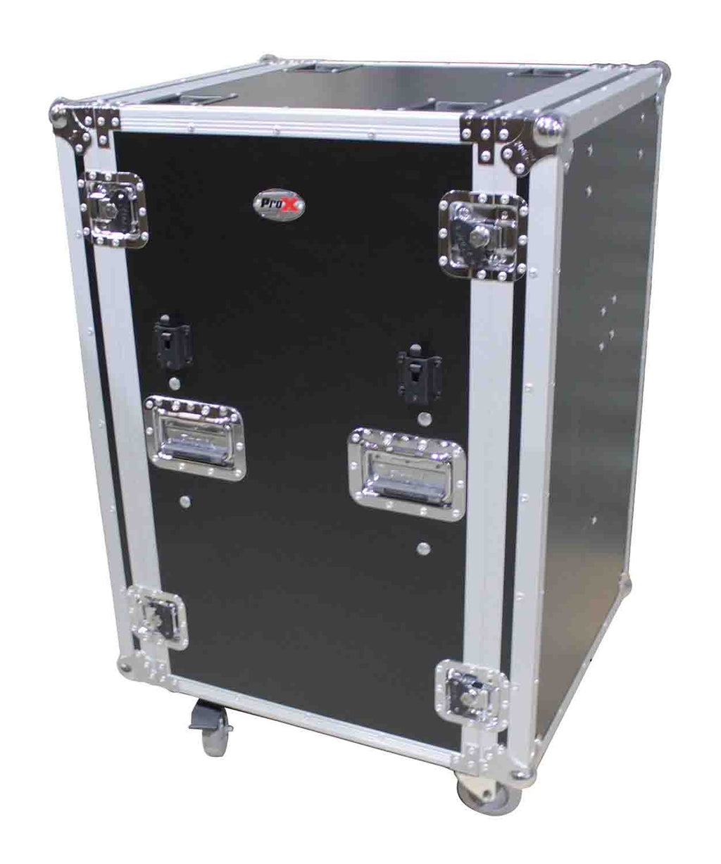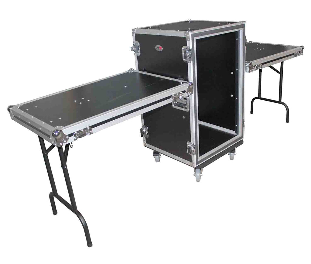 The Prox T-14RSP24DST is a 14U Vertical Shockproof Amp/Rack Case with Dual Side Tables and 4 Casters - 24-inch Rail to Rail. The T-14RSP24WDST Workstation Case is constructed with our Signature Series Plywood and reinforced steel ball corners for years of on the road use. The Workstation boasts a black honeycomb laminated finish with a sharp, modern look that fits right in with a variety of environments. The inside of the case features 1 1/2" Foam for Very Efficient Shock Protection. This case features a Shock Resistant rack space and two side work tables to keep your gear organized and easily accessible for your professional events. The 14 Unit Rack Space can be loaded from either side depending on your needs.
