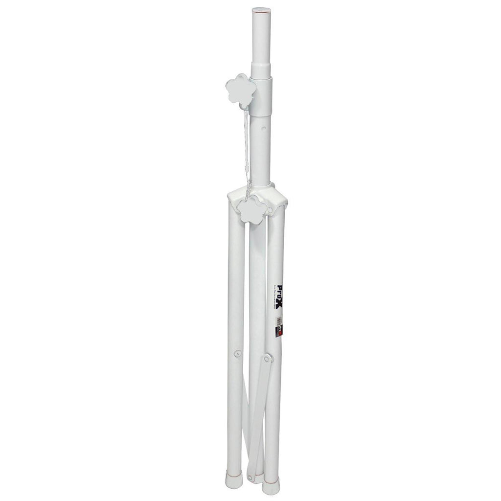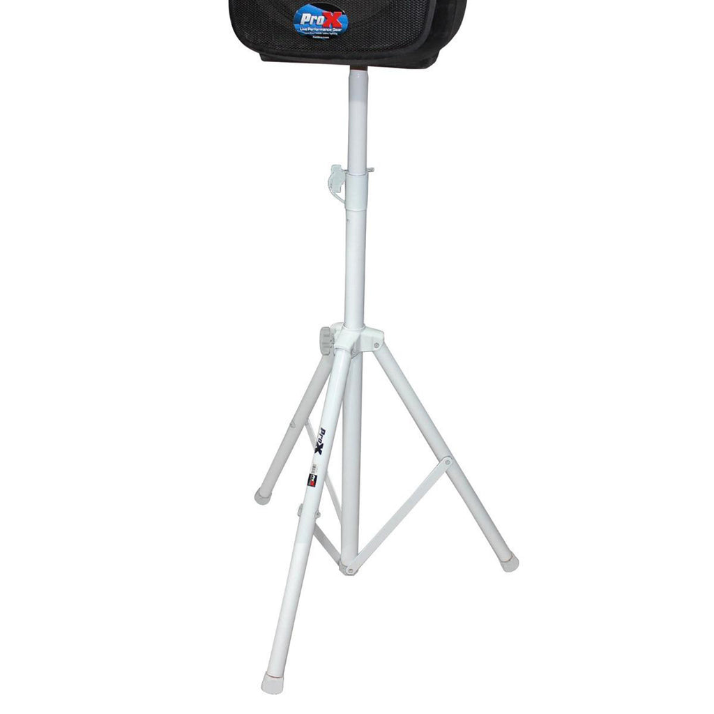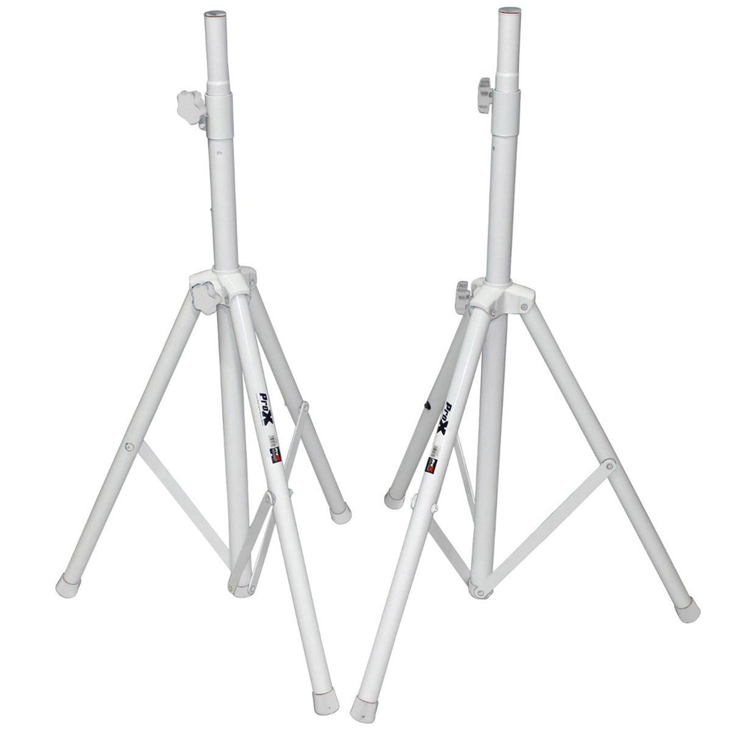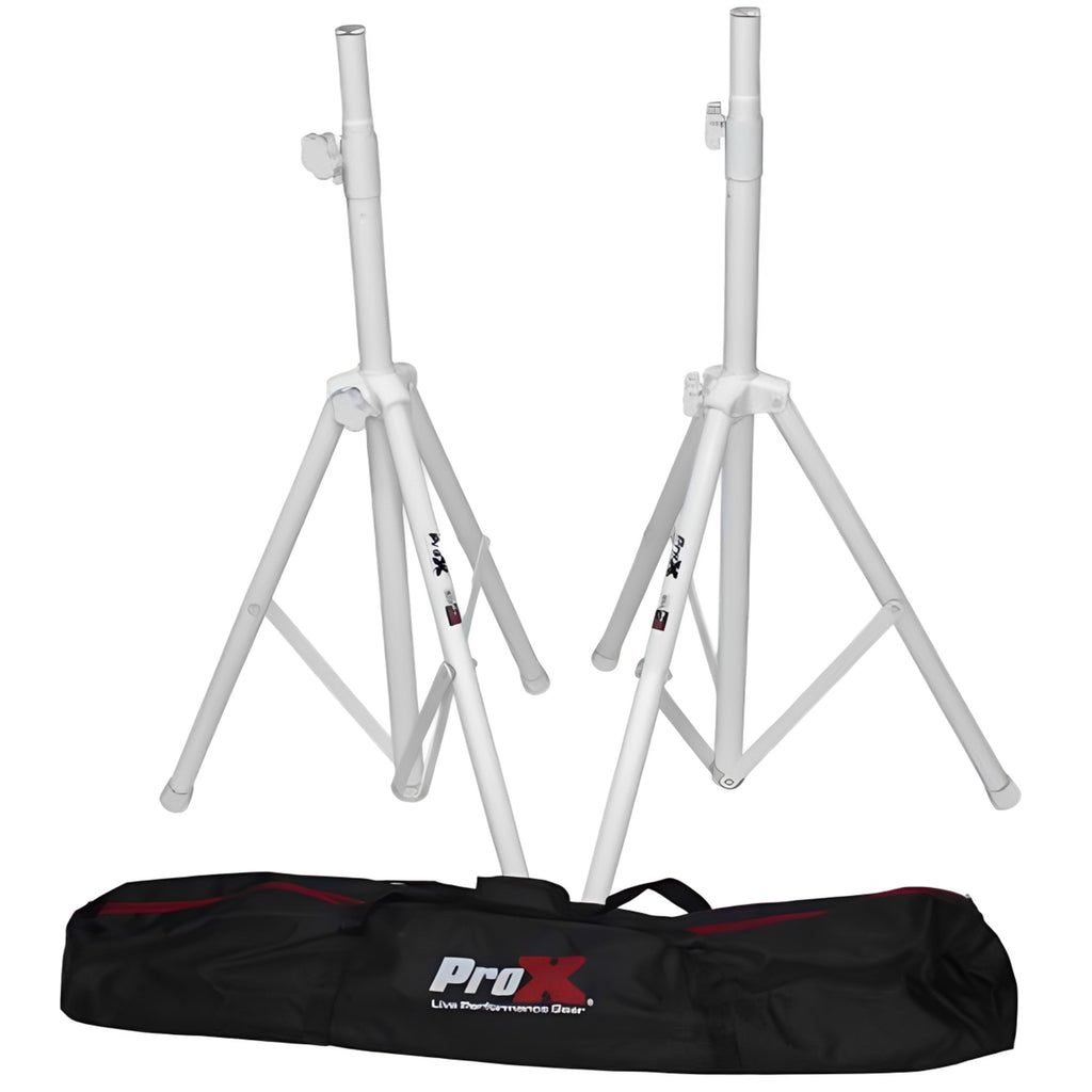 The ProX T-SS28P is a White Heavy Duty All Metal Speaker Tripod Stand Set of 2, 4-7 ft (44"-84") Cloud Series professional speaker stands are essential for on-the-go musicians, mobile DJs, and anyone who needs quick, convenient PA setup. Day in and day out, this steel and aluminum stand adjusts to your needs quickly and easily and stays that way until after the show, where you'll appreciate how quickly it collapses for transport. Focus on your performance instead of your equipment. Newly designed locking pin mechanism keeps tubing protected and locks vertically and horizontally. This stand also features all metal joints making this a real heavy-duty stand. As a package, you get 2 aluminum stands as well as a double carrying case for ease of transport.