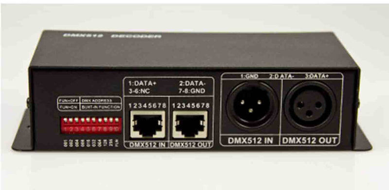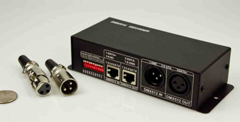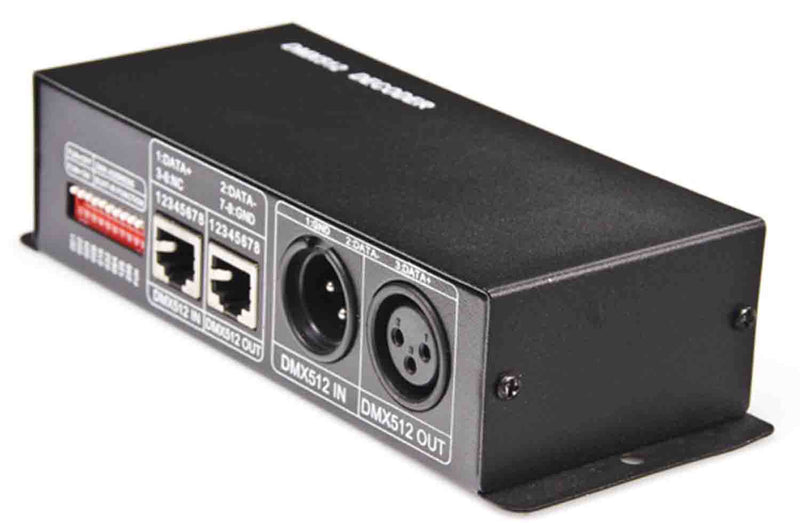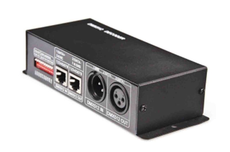 The ProX X-DMX3CH is a DMX Control Interface 3 Channel and LED DMX 512 Decoder 12-24V DC 8 Amp 3 Channel RGB RJ45.