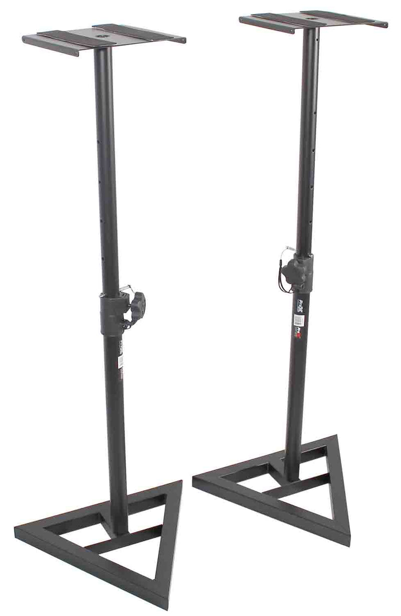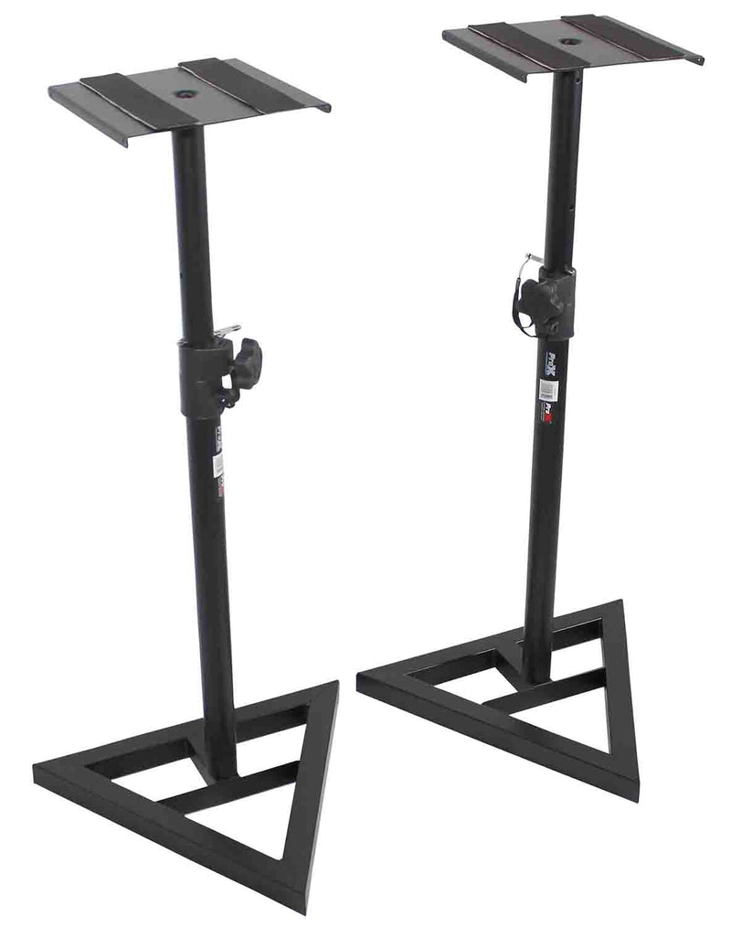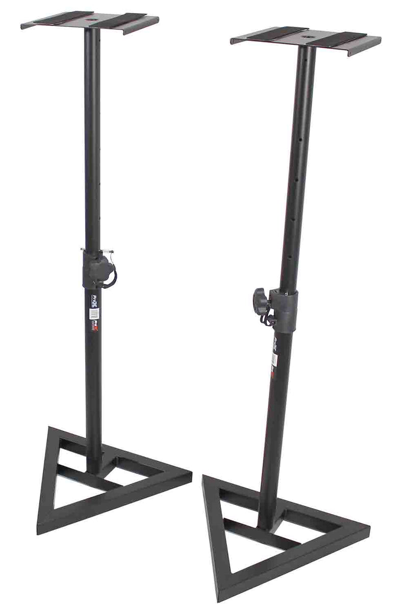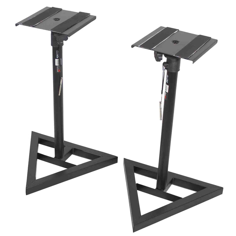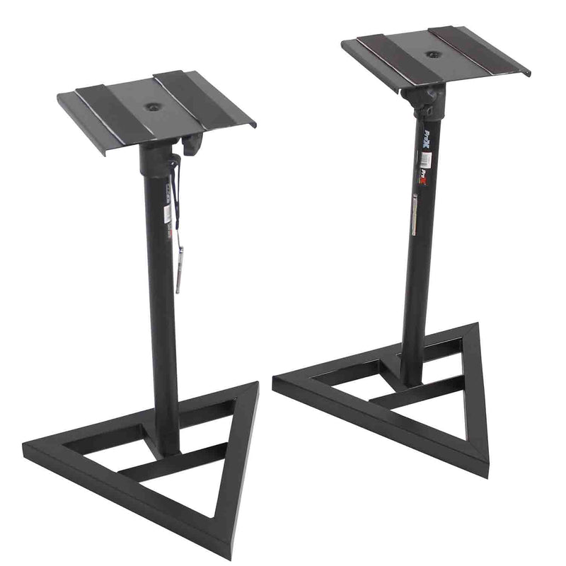 ProX professional monitor speaker stands are essential for musicians, mobile DJs, and anyone who needs a quick, reliable, and convenient monitor speaker setup. These are perfect anywhere you need to place nearfield monitors but have tight space requirements. The triangular metal bases have adjustable leveling screws for irregular surfaces.