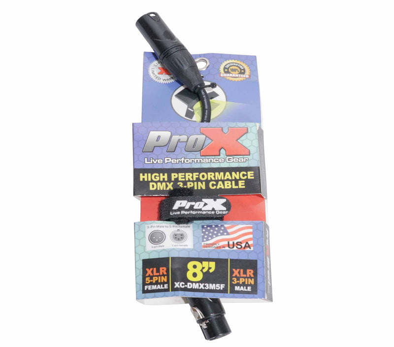 The ProX XC-DMX3M5F 6" Male XLR-3 to Female XLR-5 DMX Cable Adapter cable is ideal for DMX connection applications where a device with a male XLR-3 DMX output/input needs to be connected to a device with a female XLR5 DMX output/input. 22AWG Oxygen-Free Copper (OFC) conductors for maximum signal transfer.