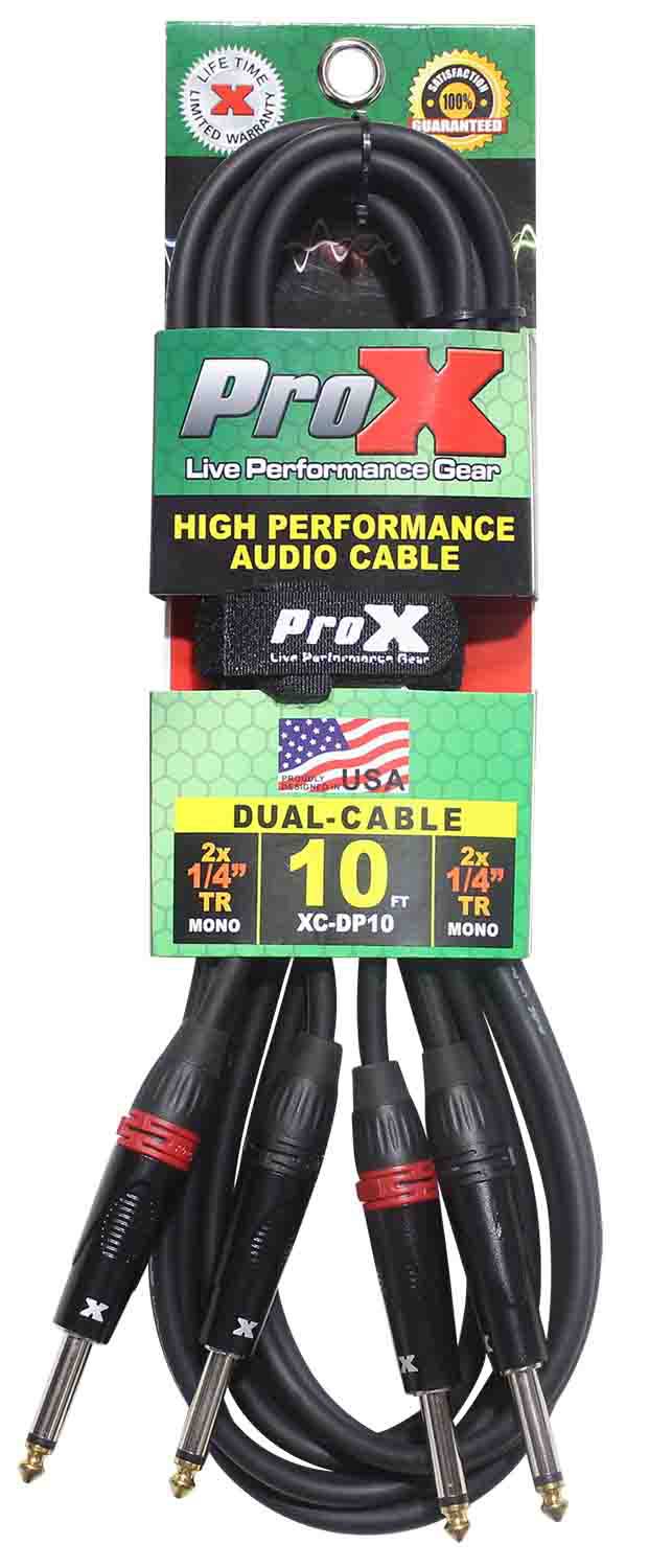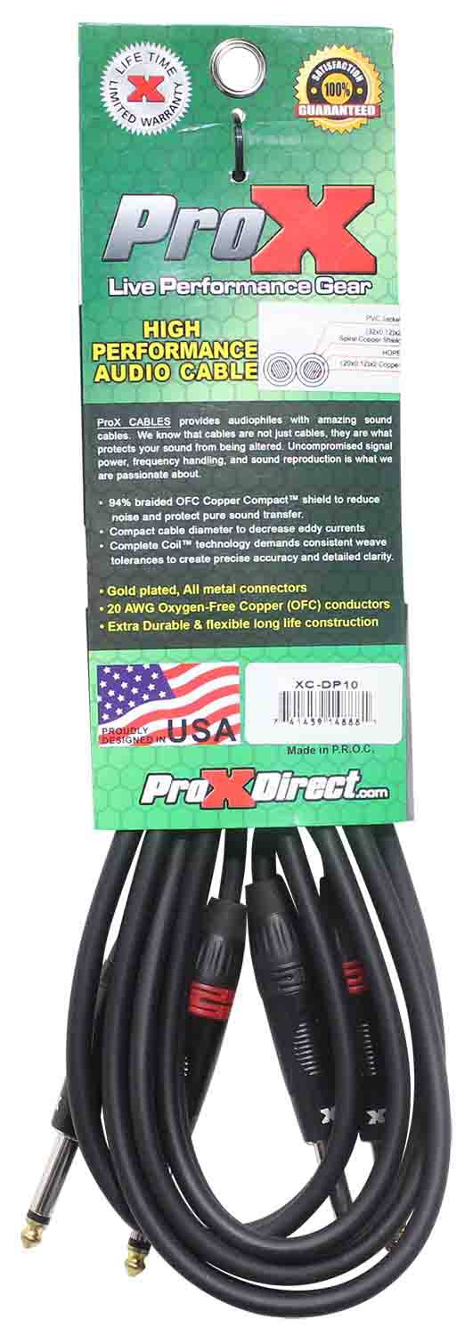 The Prox XC-DP10 is an Unbalanced Dual 1/4" TS-M to Dual 1/4" TS-M High-Performance Audio Cable - 10 Feet is ideal for professional touring and live sound applications where a device with a Dual 1/4" TRS-M output/input needs to be connected to a device with a Dual 1/4" TRS-M output/input. 20 AWG Oxygen-Free Copper (OFC) conductors for maximum signal transfer. ProX cables are built with uncompromised quality with excellent performance at each connection - Instrument cables, Speaker cables, RCA cables, DMX cables, Power cables and more. Our cables are made for professionals, by professionals.