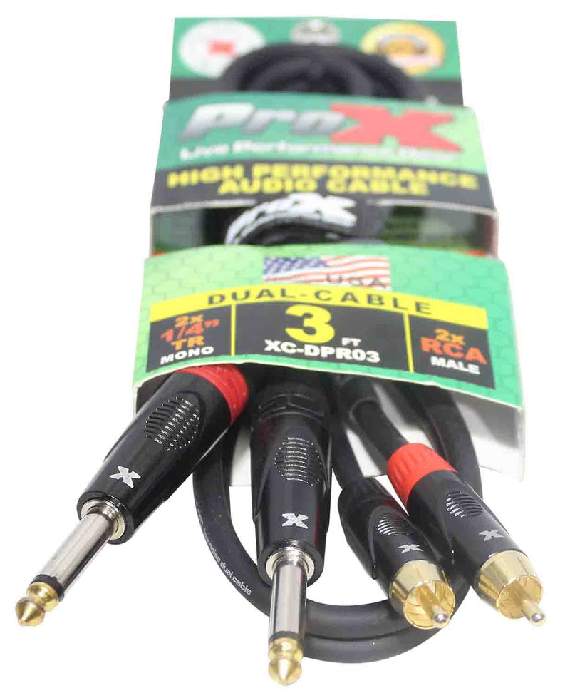 The Prox XC-DPR03 is an Unbalanced Dual 1/4" TS-M to Dual RCA-M High-Performance Audio Cable - 3 Feet is ideal for professional touring and live sound applications where a device with a Dual 1/4" TRS-M output/input needs to be connected to a device with a Dual 1/4" TRS-M output/input. 20 AWG Oxygen-Free Copper (OFC) conductors for maximum signal transfer. ProX cables are built with uncompromised quality with excellent performance at each connection - Instrument cables, Speaker cables, RCA cables, DMX cables, Power cables and more. Our cables are made for professionals, by professionals.