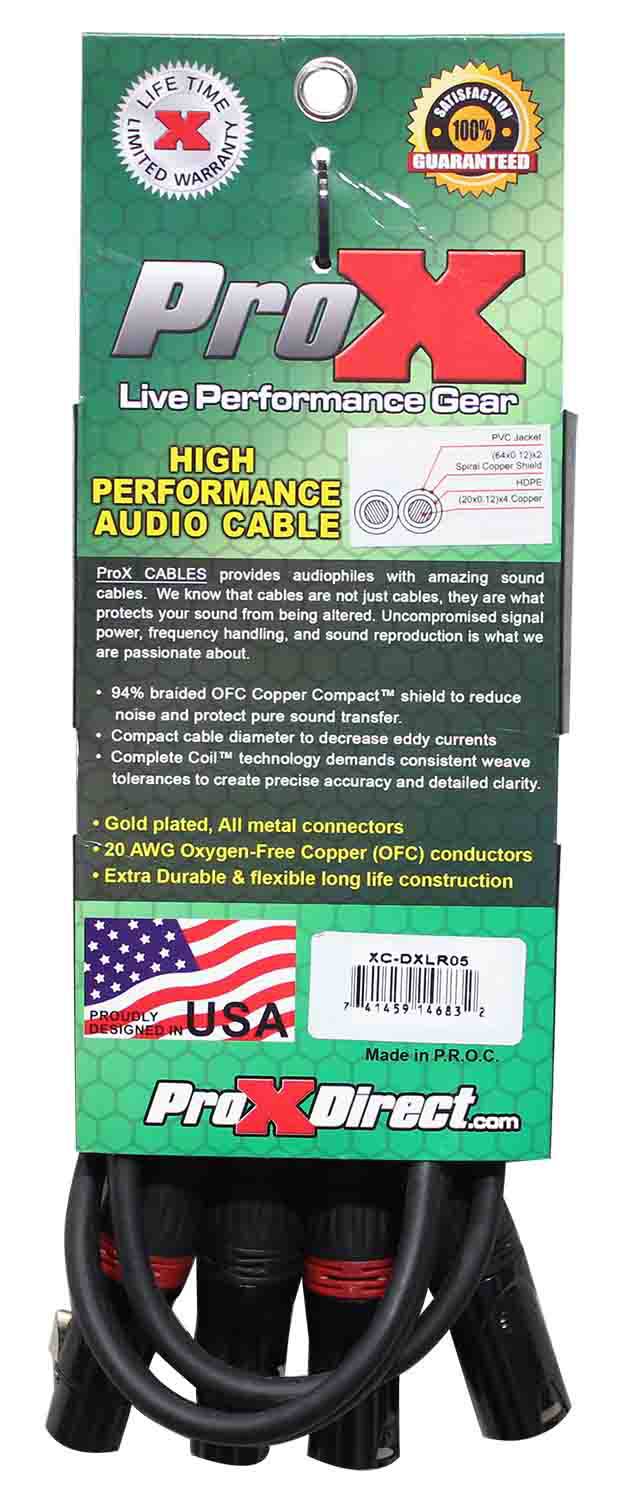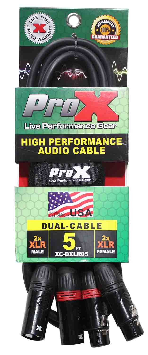 The Prox XC-DXLR05 is a Balanced Dual XLR-M to Dual XLR-F High-Performance Audio Cable - 5 Feet is ideal for professional touring and live sound applications where a device with a dual XLR-F output/input needs to be connected to a device with a dual XLR-M output/input. 20 AWG Oxygen-Free Copper (OFC) conductors for maximum signal transfer.ProX cables are built with uncompromised quality with excellent performance at each connection - Instrument cables, Speaker cables, RCA cables, DMX cables, Power cables and more. Our cables are made for professionals, by professionals.