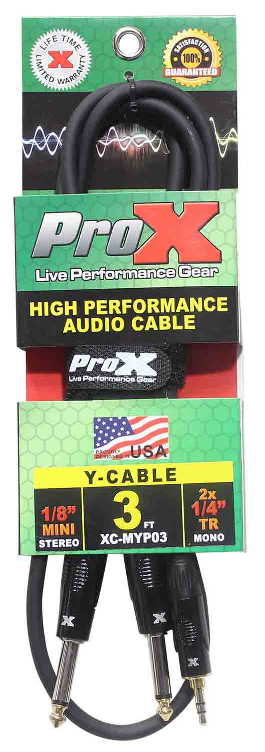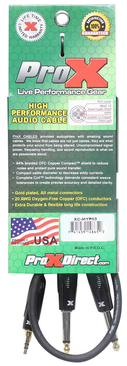 The Prox XC-MYP03 is an Unbalanced 3.5mm Mini-TRS to Dual TS-M High-Performance Audio Y Cable - 3 Feet is ideal for professional touring and live sound applications where a device with a 3.5mm Mini TRS-M output/input needs to be connected to a device with a Dual 1/4" TS-M output/input connections. ProX cables are built with uncompromised quality with excellent performance at each connection - Instrument cables, Speaker cables, RCA cables, DMX cables, Power cables, and more. Our cables are made for professionals, by professionals.
