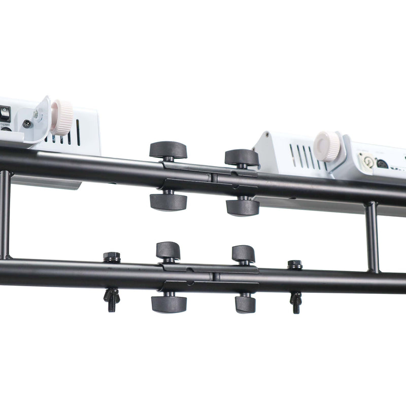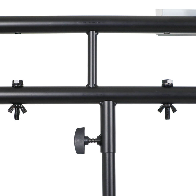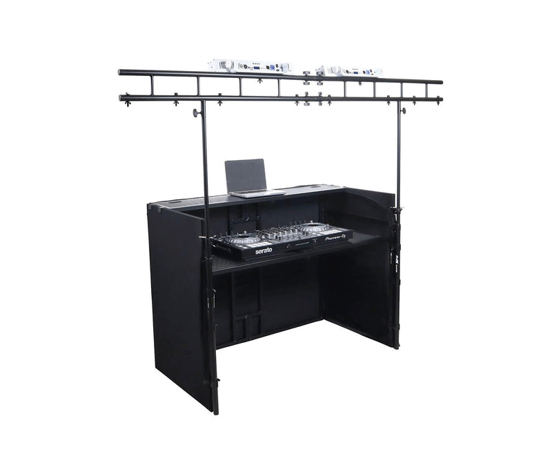 The ProX MESA MEDIA TRUSS PKG DJ TV Façade Workstation and Truss gives you an elegant professional look. With its strong and lightweight 4-sided folding aluminum frame with black finish PLUS integrating our XT-SSTM3260 Universal TV/Monitor Mount on the front. This media added DJ booth Is all you need for an exceptional DJ station. The setup of the system is easy and takes less than 10 minutes even with mounting the LED TV/Monitor. You can transform your DJ setup and expand your professional image with a video screen. The XF-MESA MEDIA has an additional top shelf and the table workspace is adjustable to three different positions. Two cable pass-throughs on both the top shelf and tabletop. Come with the XF-MESATRUSS to add lighting and accessories for mobile setup.