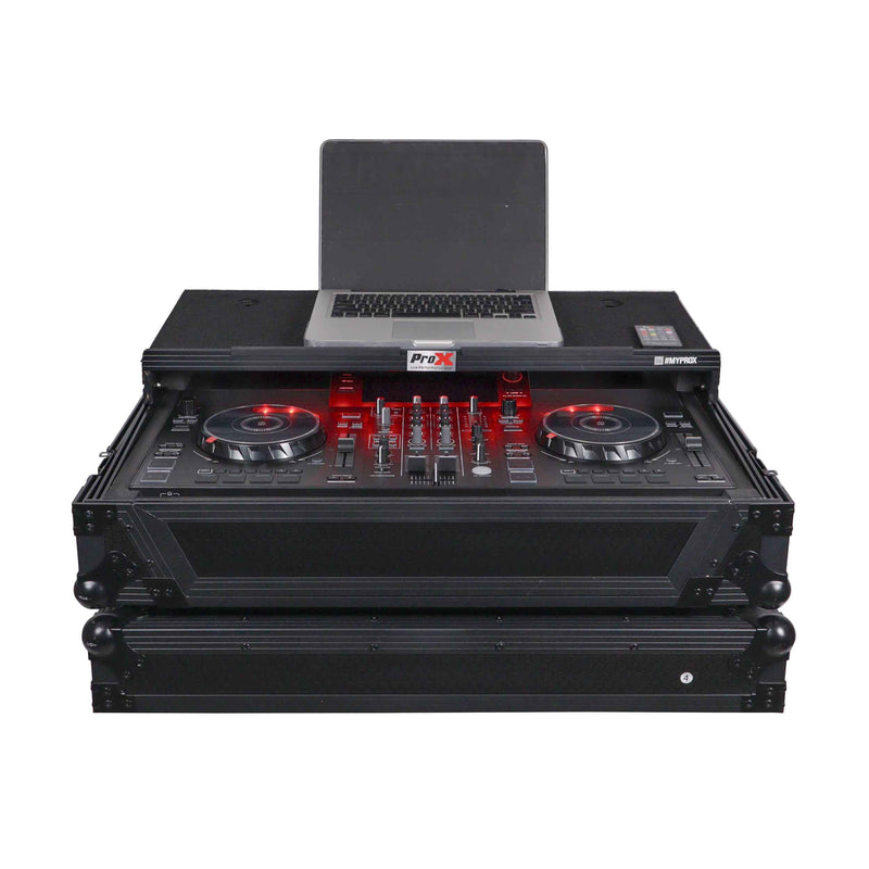 ProX Gig-Ready Series cases are constructed from rugged 3/8" Plywood, reinforced with steel ball corners, spring-loaded recessed padded handles, and twist-locking latches. There is additional space for cables and small accessories at the rear underneath the controller for convenience. The removable front panel allows for easy access to the DJ controller front control knobs, headphones, mic jacks, etc.