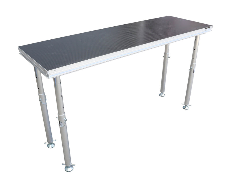 The ProX XSQ-2X6 StageQ 2' x 6' Single Stage Unit Height Adjustable from 28 to 48" in. This ProX StageQ Stage unit is a convenient and portable staging solution that is built for long-lasting use and durability. These Stages are designed to minimize setup times and give you the ability to transport and set up in minutes.  Each unit comes with four height-adjustable Telescoping legs that raise the stage's height from 28-inch to 48-inch with totally stabilized functionality.