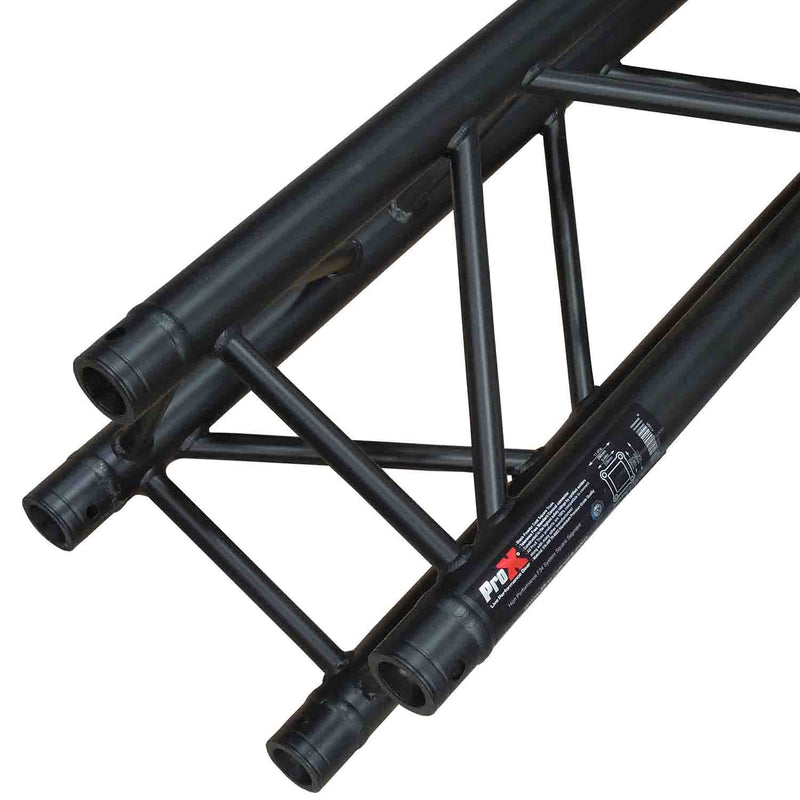 The ProX XT-SQ820BLK is an F34 truss segment black powder coated 8.20 Feet and 2mm wall is one the most trusted staging support systems in the industry and is built to the highest standards of safety and performance. It's a rugged and durable trussing solution perfect for live outdoor productions, nightclubs, and permanent installations. ProX XT Series Truss compares favorably to the other major trussing manufacturers. Our outstanding quality control and manufacturing techniques assure excellent fitment at every connection. Manufactured with EN-AWT6 6082 Aluminum for safety and strength. Our XT series F34 square truss utilizes a standard conical connector system, which easily mates with other brands of the truss of the same size and connector type, and is available in a variety of lengths to suit your designs. ProX offers a wide variety of corners, base plates, connectors, and accessories that add stability while expanding on limitless design configurations.