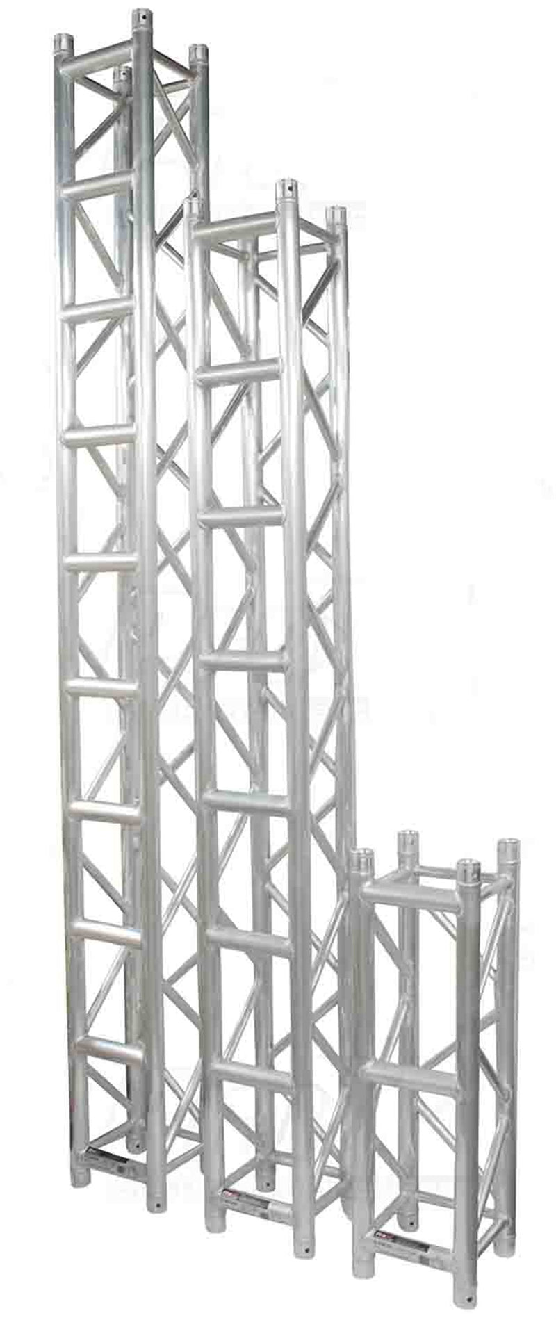 The Easy to Climb, Professional Ladder Truss is a square truss that has one side as a ladder with 2" tubes with 9 3/4" spacing and utilizes a standard conical connector system, which easily mates with other brands of truss of the same size and connector style, and is available in a variety of lengths to suit your designs. It also works with different types of corners, base plates, connectors, and accessories that add stability while expanding on limitless configurations. Always consult an engineer for complex designs.