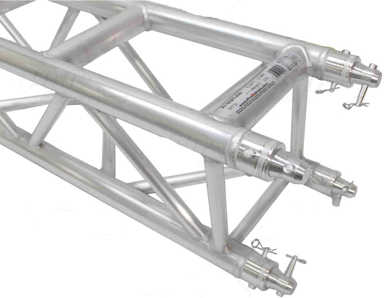 The Easy to Climb, Professional Ladder Truss system is a square truss that has one side as a ladder with 2" tubes with 9 3/4" spacing and utilizes a standard conical connector system, which easily mates with other brands of truss of the same size and connector style, and is available in a variety of lengths to suit your designs. It also works with different types of corners, base plates, connectors, and accessories that add stability while expanding on limitless configurations. Always consult an engineer for complex designs.