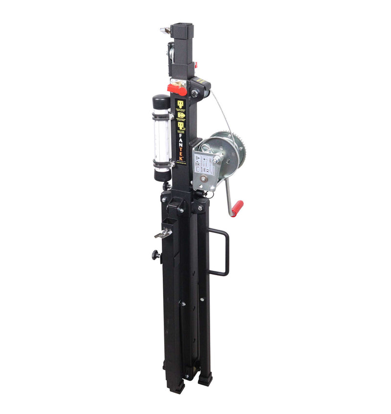 The Fantek T101 model telescopic lifting tower is a tower designed to lift loads vertically while allowing easy transport in a minimum space. It is composed of three extensible steel profiles elevated by a high-resistance steel cable guided by grooved pulleys with SELOIL bronze bearings. Fixing of the tower section at the working height with an automatic steel safety pin. Legs with non-slip rubber pads. The entire system is operated by a manually operated winch. Fantek ATC-MOB Universal truss support for all models of top-loading towers. Allows truss to be anchored to the tower.