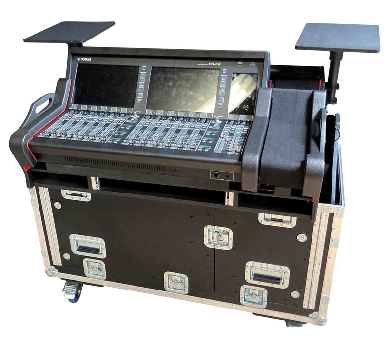 The ProX XZF-YDM7EX1U LMA is a Flip-Ready Hydraulic Console Easy Retracting Lifting 1U Rack Space Flight Case for Yamaha DM7-EX with wheels by ZCASE. ProX is a distributor of ZCASE Flip-Ready Patented Hydraulic Lift Console Cases. Flip case for Yamaha DM7 and DM7-EX Universal Flip case for Yamaha DM7 and DM7-EX with 1x1U under the console. XZF-YDM7EX-1X1U is made for easy transport and operation of Yamaha DM7-EX digital audio consoles. Typically, most console cases require two or more people to lift onto a table or stand. This live-in audio and lighting console case are made for a single user to transport, and roll in, and requires No More Heavy Lifting The console mechanism can be lifted vertically with the touch of one finger. Our high-quality Flip-Ready Console cases are handcrafted in Poland by ZCASE and are individually tested for quality assurance and functionality. This case is the answer to the prayers of every Audio and Lighting Technician who was faced with the challenge of setting up an FOH heavy console requiring two or more persons to transport and lift.