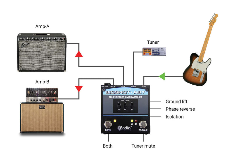 You can use the BigShot ABY as a simple mute footswitch for quiet on-stage tuning. Simply depress the AB selector switch and the signal going to the amp is turned off. This keeps the signal going to the tuner output always on, allowing you to tune without bothering others.