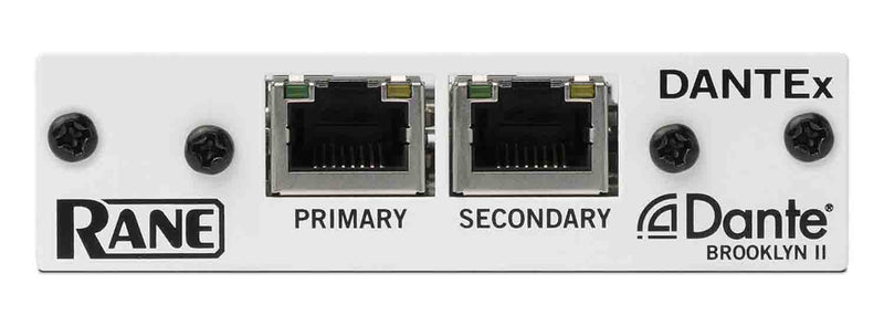 The Rane DANTEX is a Dante Expansion Card for Terminal 1010X Processor that allows system designers to integrate a Terminal 1010x processor with Dante-equipped microphones, amplifiers, breakout boxes, mixing consoles and other supported devices. It provides 32 inputs and 32 outputs of Dante digital audio with supported samples rates of 44.1kHz, 48kHz, 88.2kHz and 96kHz. Built-in sample rate conversion (SRC) converts the Dante sample rate to the fixed 48kHz sample rate required by the Terminal 1010x.