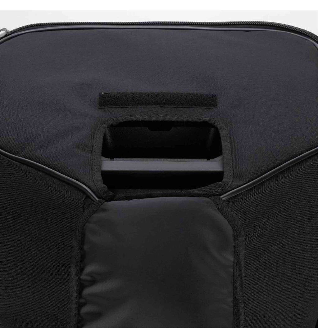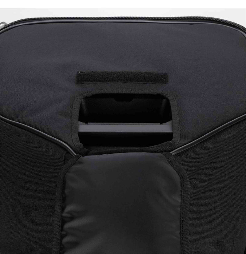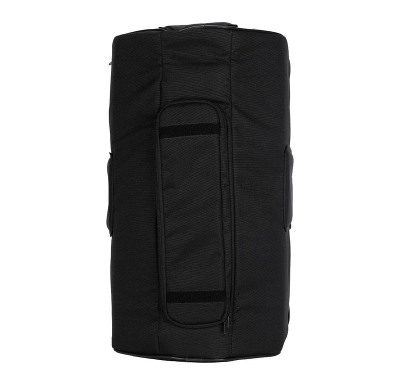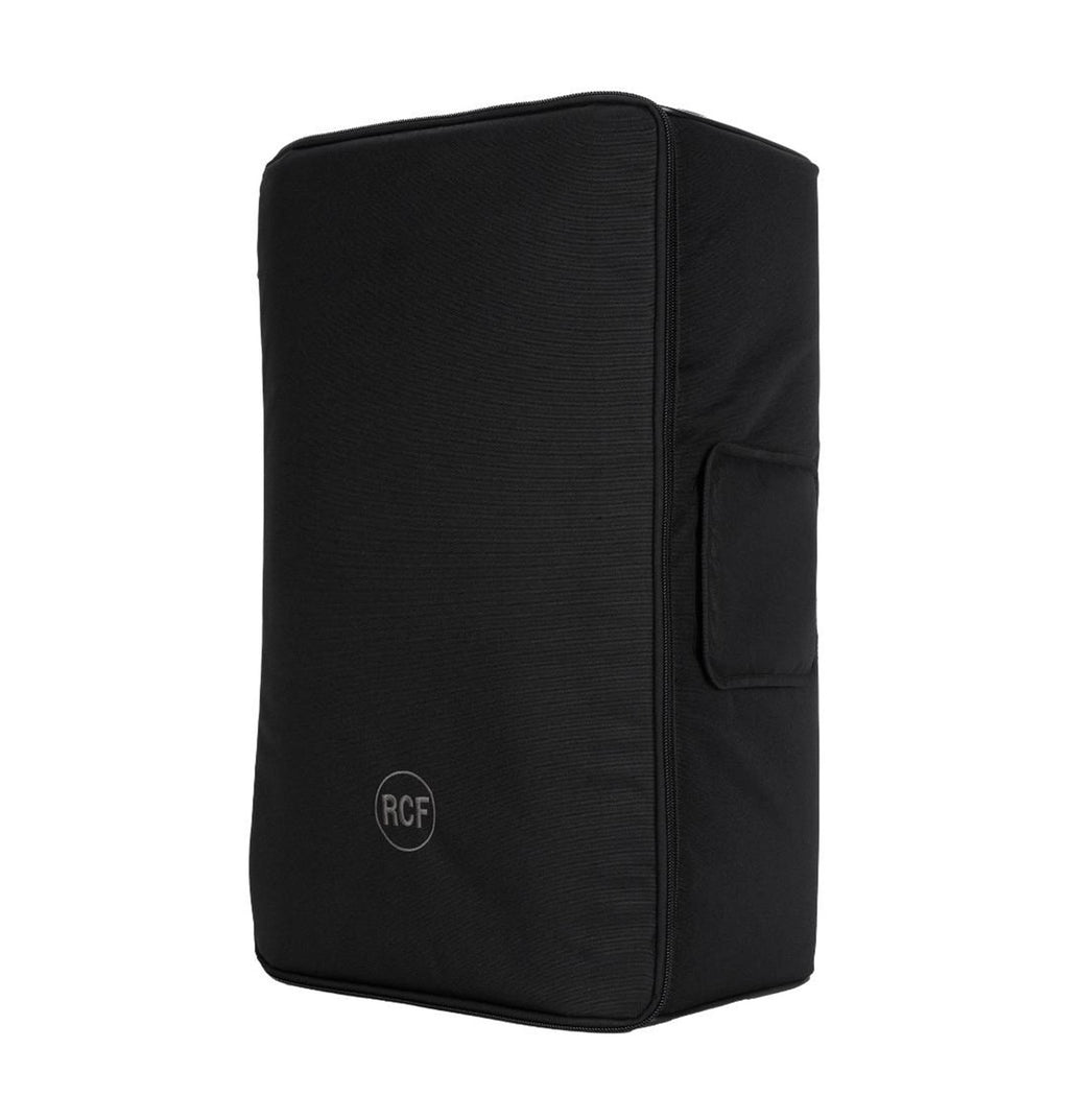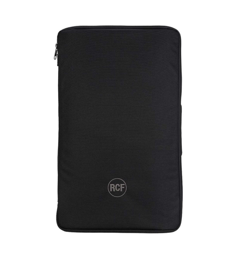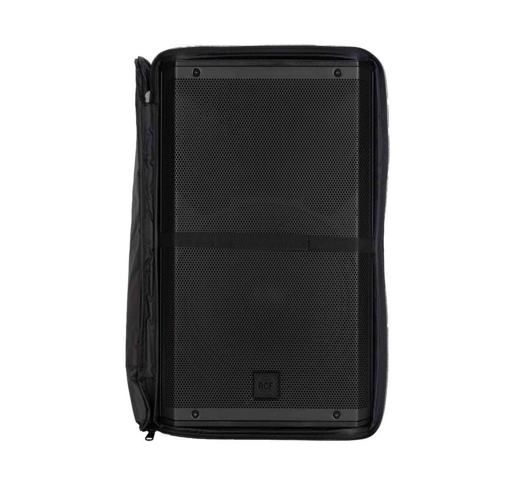 The RCF ART-COVER-915 Padded Cover for ART 9 Series 15" Models features heavy-duty weatherproof polyester outer fabric, foam rubber padding, and zip openings with Velcro fasteners. The frontal cover can be opened and blocked with Velcro on one side. It features multiple openings for handles, for the rear connection panel, and the pole mount cap.