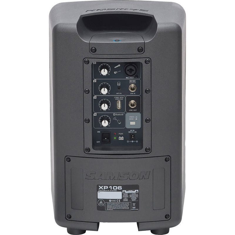 The XP106's 4-channel mixer features multiple input options with separate level controls, including an XLR-1/4" combo channel (included dynamic handheld mic and other Mic/Line level devices), a 1/4" channel (guitars and other line level devices), an 1/8" channel (MP3 players, keyboards, etc.) and a Bluetooth channel to wirelessly stream music from your smartphone, tablet or laptop. The XP106 also has a Line Out to cascade multiple systems together and expand your sound, as well as a Music/Speech switch for optimizing output EQ for speech or music playback. The system even has a USB Wireless port for integrating Samson's Stage XPD1 USB Digital Wireless System (not included) into the fold and creating a completely wireless audio solution.