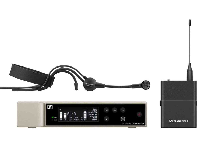 The Sennheiser EW-D ME3 SET is a Digital Wireless Cardioid Headset Microphone System (Q1, R1, R4). Versatile and feature-rich digital wireless system for those who speak or present that allows for seamless product pairing and management via the EW-D Smart Assist App. With a metal housing, the robust bodypack transmitter and unobtrusive clip-on microphone ME 3 (cardioid) with high speech intelligibility suit perfectly for daily use on stage.