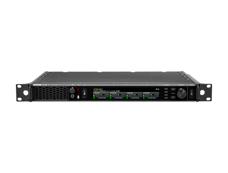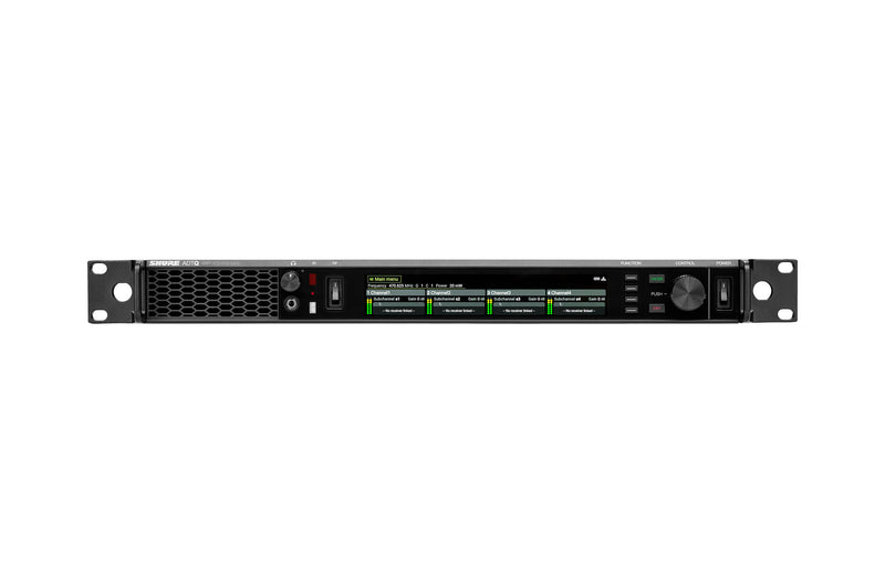 The Shure ADTDDC-G57, Axient Digital PSM Dual Transmitter DC - G57 (470 to 608 MHz) allows monitor engineers, RF engineers, rental houses, and production companies to deliver four stereo channels or eight mono channels of legendary Shure audio quality to their talent's ADXR bodypacks and preferred in-ear monitors—all from a single rackmount unit broadcasting over a wide 184 MHz tuning range. This ultra-flexible flagship audio transmitter seamlessly integrates into existing setups and uses WMAS technology to maximize efficiency and reliability, allowing monitor engineers to spend less time worrying about technical difficulties and disruptions and instead focus on crafting inspiring mixes for musicians and artists. The scalable system lets RF engineers quickly and easily create complex setups, incorporating multiple mixes tailored to suit performers working in large touring productions and top-tier events.