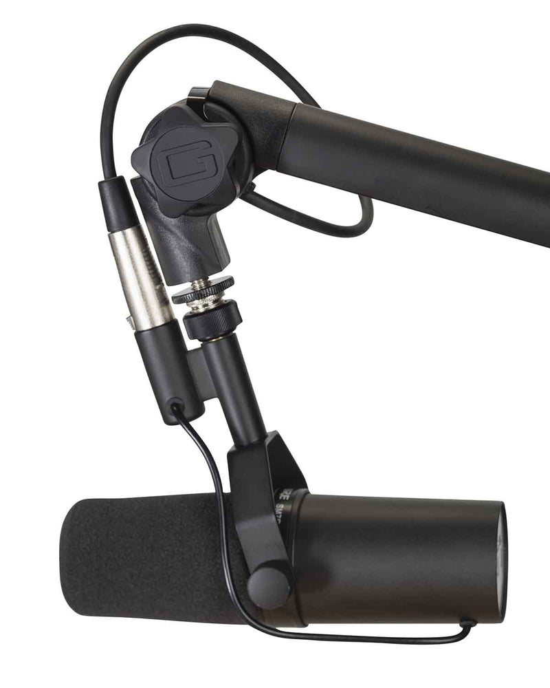 This is our favorite Microphone Boom Arm from Gator Frameworks is super nice to use. If you're serious about your podcasting mic stand and want to look more professional this is it. The cable is included and built into the boom arm to keep your desktop clean of cables!
