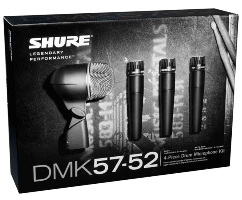 The Shure DMK57-52 is a Drum Microphone Kit conveniently packaged selection of microphones and mounts, designed to offer a core package of microphones for recording and performing drummers at a great price. Industry-standard drum microphone and hardware kit features options for kick drum, snare drum, rack toms, floor toms, and congas.