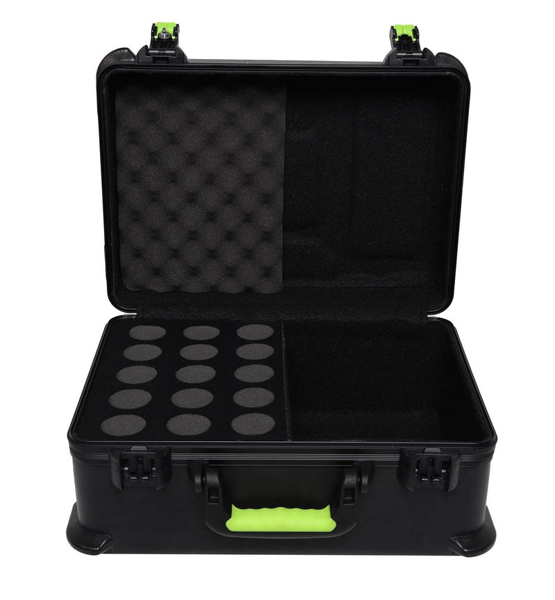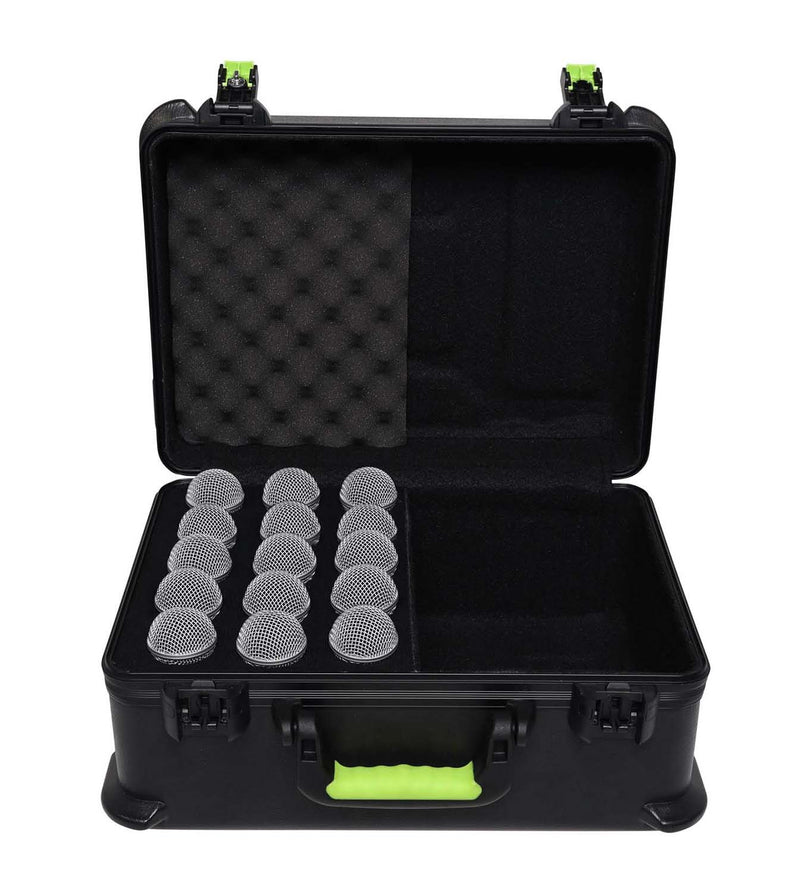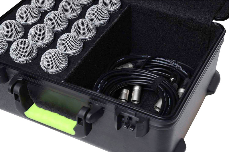 The Shure MICCASE15 Plastic Case with TSA-Accepted Latches for 15 Wired Microphones is a molded case that can hold up to 15 Shure or other wired microphones. It is made from heavy-duty polyethylene and has TSA-accepted locking latches, making it ideal for air travel. To protect your mics, the case has foam-padded microphone drops. There is an internal storage compartment for cables and accessories.