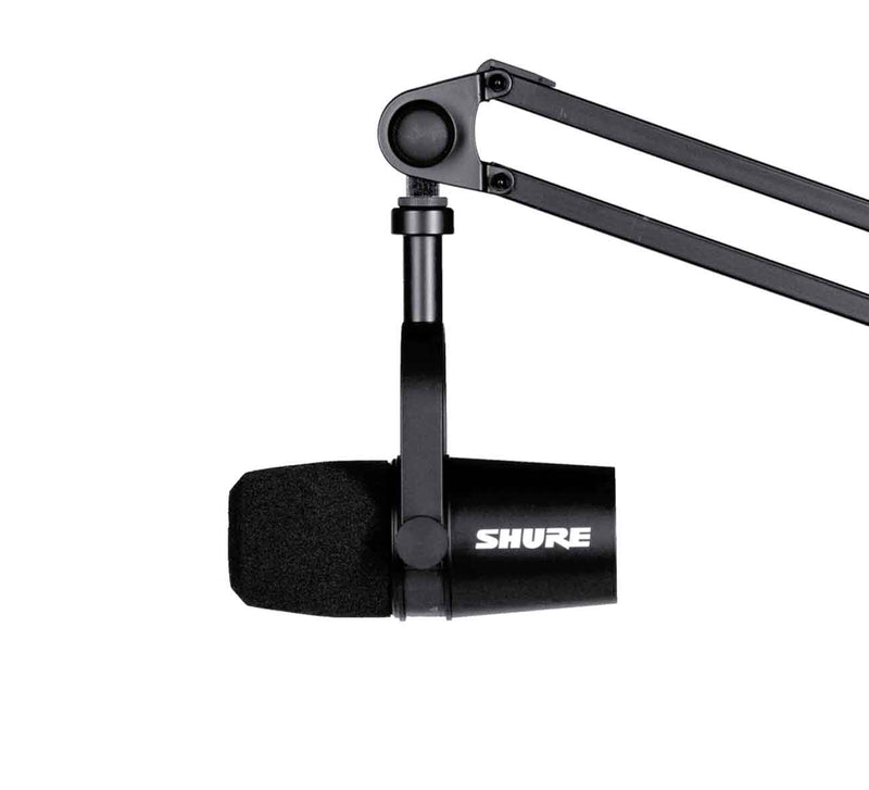 This Microphone Package Includes the Shure MV7-K USB Podcast Microphone with Gator 3000 Gator Deluxe Desktop Mic Boom Stand.