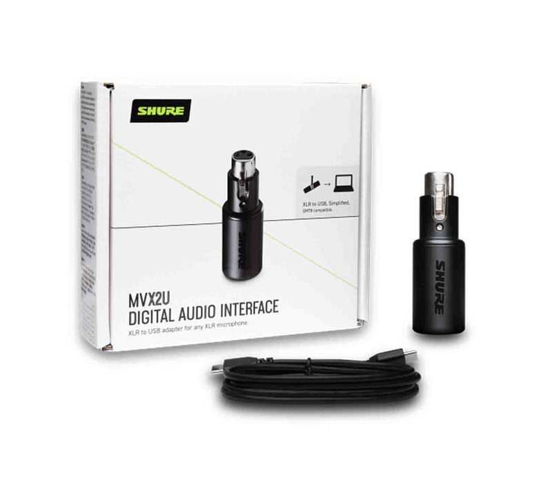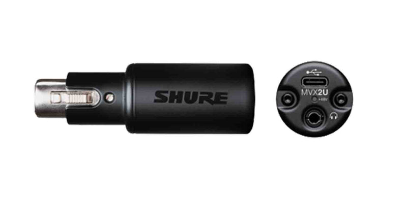 The Shure MVX2U Motiv Digital Audio Interface XLR to USB Adaptor. The MVX2U Digital Audio Interface is a powerful, single-channel XLR-to-USB adapter that allows you to connect any XLR microphone to a computer for effortless recording and streaming. With configurable DSP features and full access to ShurePlus MOTIV Desktop App, the compact interface is future-proofed via online firmware updates. Providing up to 60dB of clean gain, the XLR-to-USB adapter has enough power to bring your favorite dynamic microphone, such as the legendary SM7B, to life. It also offers up to 48v of phantom power for connecting a condenser microphone to your computer. Portable, sleek and rugged, the MVX2U can be plugged straight onto an XLR microphone or used in-line with an XLR cable, depending on your setup.