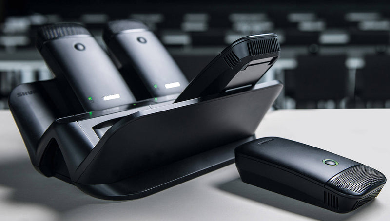 The Shure SBC450-US is a 4-bay Networked Docking Station Charger with Power Supply and up to 4 ULXD6 or ULXD8 transmitters equipped with the SB900A Rechargeable Battery. Features include remote viewing of charging status and compatibility with Wireless Workbench and SystemOn.