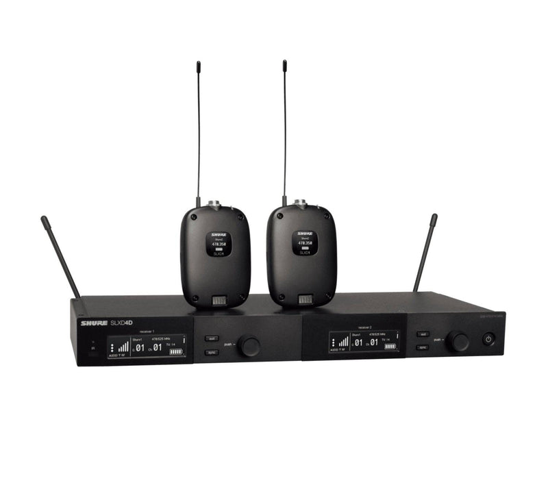 The Shure SLXD14D is a Dual Wireless System with Two SLXD1 Bodypack Transmitters provides transparent digital audio and rock-solid RF stability for lecture halls and live performances. The SLXD14D Dual Wireless System delivers transparent, 24-bit digital audio and rock-solid RF performance for a wide range of applications, from day-long presentations to nighttime performances. Operate up to 32 compatible systems per 44 MHz band, with easy setup and optional rechargeability accessories for wireless excellence, wherever required. Ships with SLXD4D dual-channel receiver and 2 SLXD1 bodypack transmitters with antenna and rackmount accessories and 4 AA batteries.