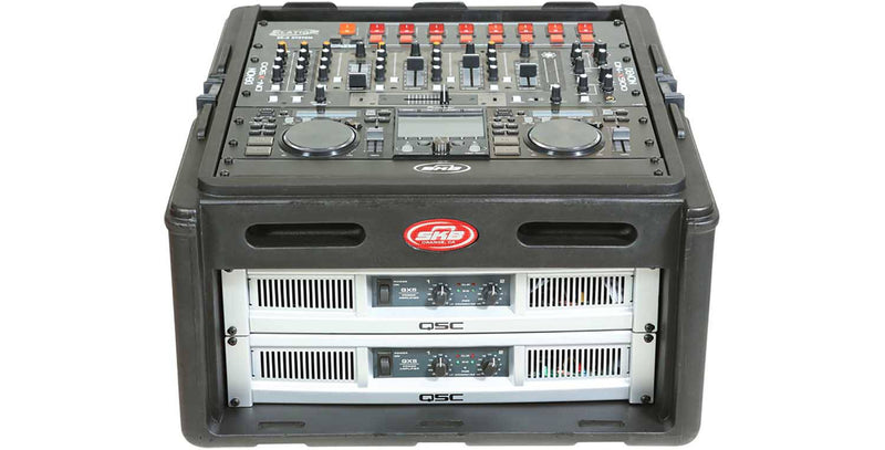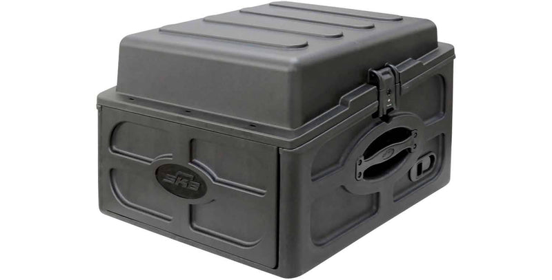The SKB Cases 1SKB-R104 is a 10U slanted top and 4U front, rack case that features steel threaded rails, hard lid and doors, side access ports (for cable routing) and has enough space to mount the AV-8 with the lid closed! The one piece base is roto-molded of Linear Medium Density Polyethylene (LMDPE) while the hard front and rear doors and lid are Injection molded of Rubber Modified Styrene (RMS). The back lid provides maximum access to the rack gear. Two TSA locking SKB patented trigger latches secure the lid while the flat hard top allows for stacking in transport and storage.