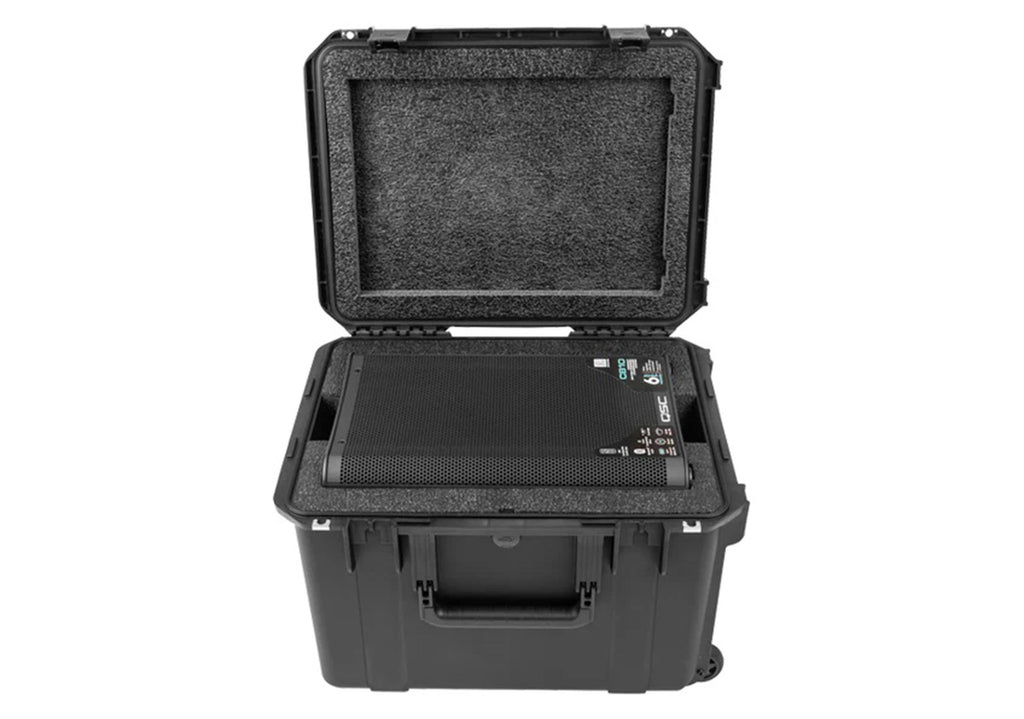 For ease of transport and long-term reliability, the case is equipped with built-in wheels and a pull handle, along with rubber over-molded cushion grip handles for comfortable lifting. Molded-in hinges and patented Trigger Latch® systems ensure secure closure, while locking loops allow the use of customer-supplied padlocks for added security. An automatic ambient pressure equalization valve maintains the watertight seal while balancing internal pressure during altitude or temperature changes, making the 3i2015-14CB a robust and travel-ready solution for protecting the QSC CB10 loudspeaker.